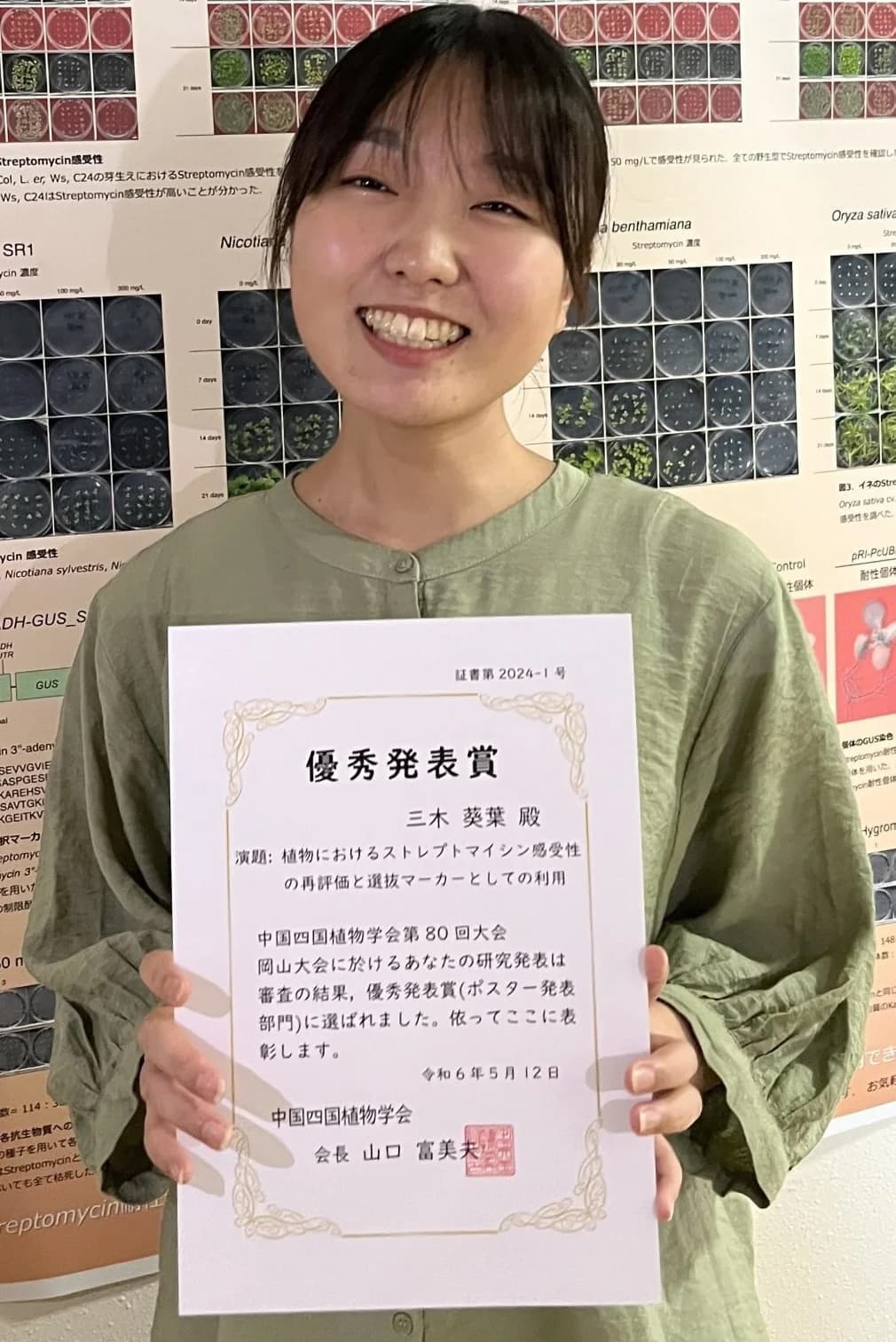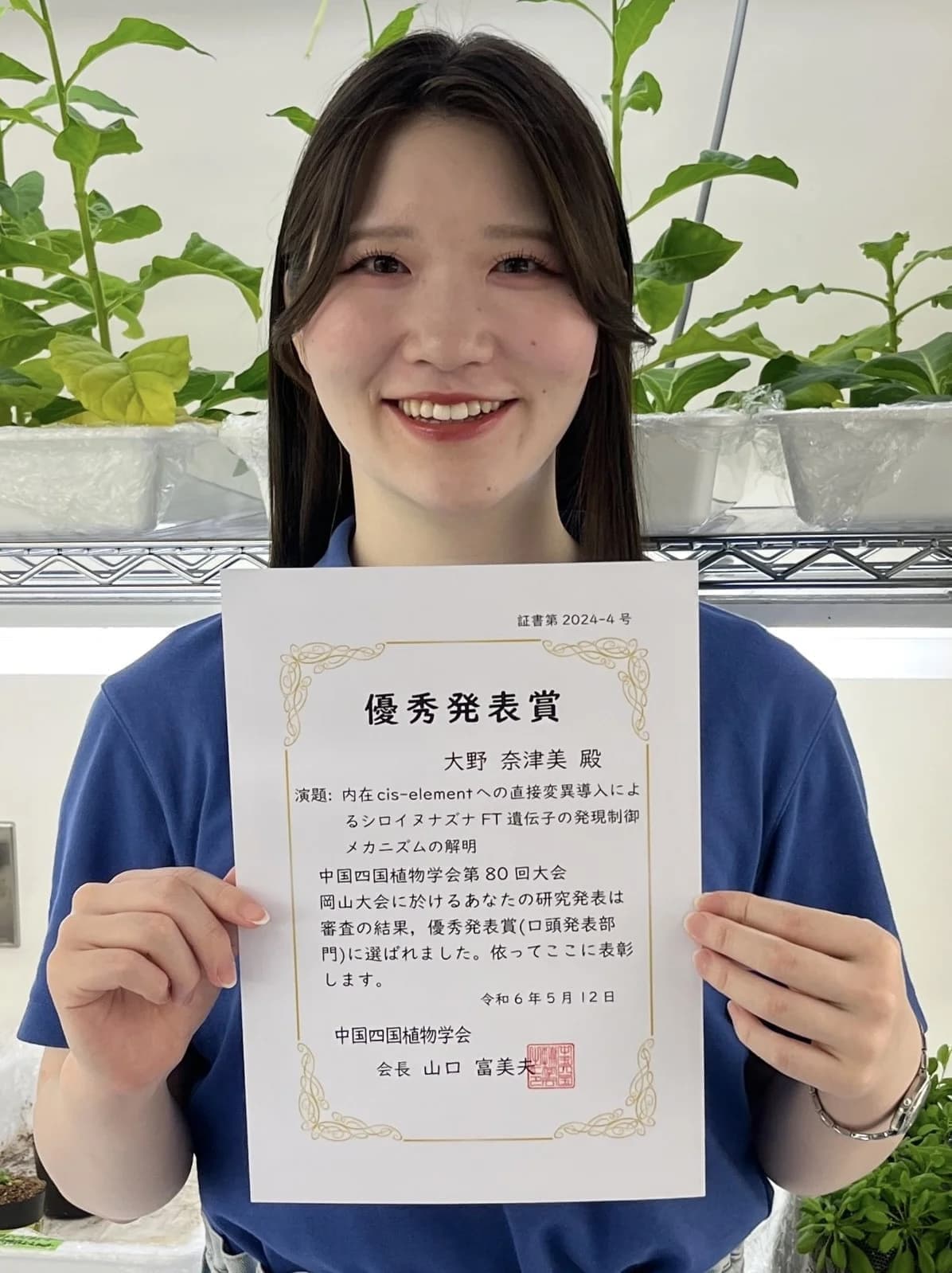 令和6年5月11日(土)、12日(日)に岡山大学で開催された「中国四国植物学会第80回大会」において、農学部4年生の三木葵葉さんが「優秀発表賞(ポスター発表部門)」を受賞しました。