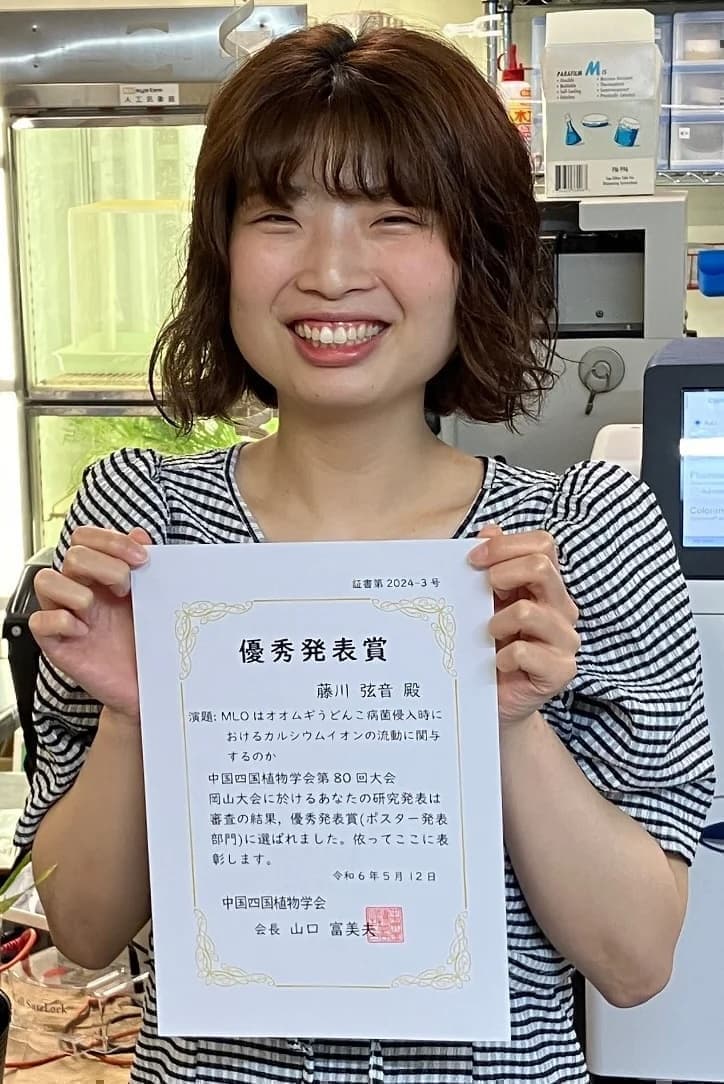 令和6年5月11日(土)、12日(日)に岡山大学で開催された「中国四国植物学会第80回大会」において、農学部4年生の藤川弦音さんが「優秀発表賞(ポスター発表部門)」を受賞しました。