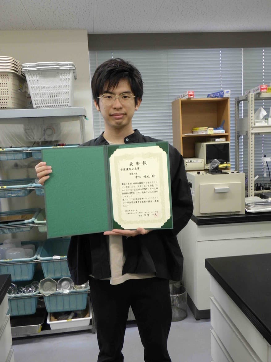 令和6年8月30日(金)〜9月1日(日)に東北大学で開催された「第41回日本植物バイオテクノロジー学会仙台大会」おいて、大学院連合農学研究科1年生の平田峻也さんが「学生優秀発表賞」を受賞しました。