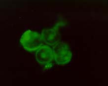 抗体産生促進因子の一種であるエノラーゼをFITCと呼ばれる蛍光物質を結合させ、ハイブリドーマに作用させた後、レーザー共焦点顕微鏡を用いて観察したものが、下の写真です。共焦点効果により、この写真は細胞を輪切りにしたのと同じ状況での観察であるので、エノラーゼが細胞内に入り込んで作用していることが分かります。