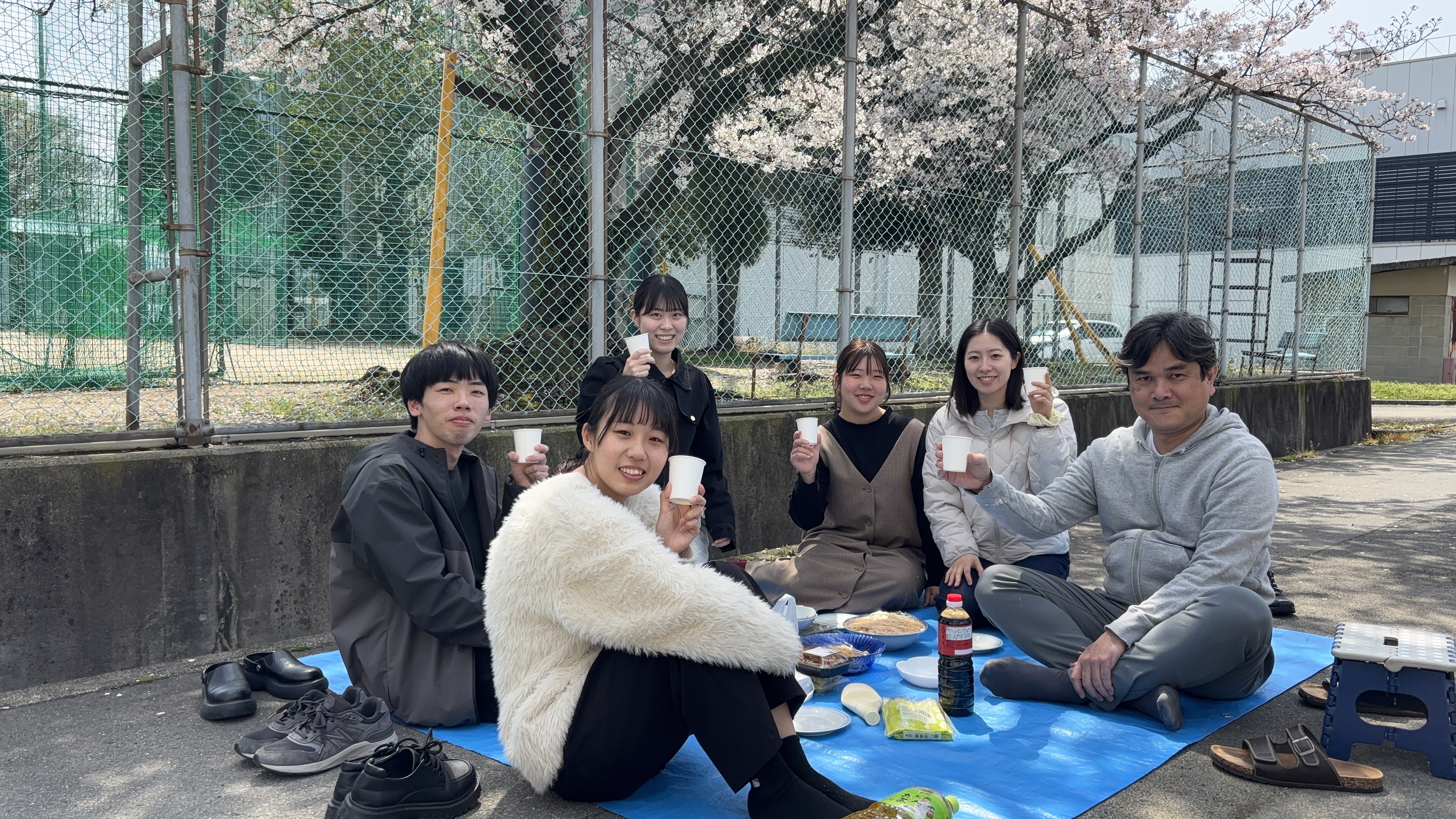 農学部構内の羊舎前で、満開の桜の下でお花見をしました