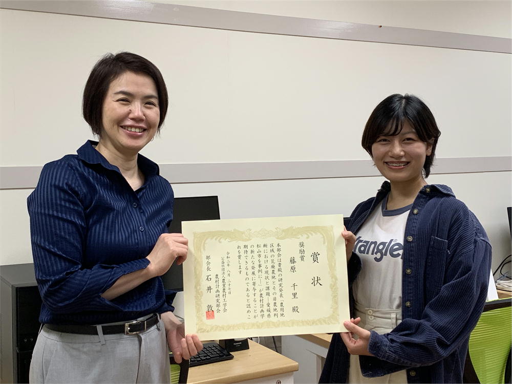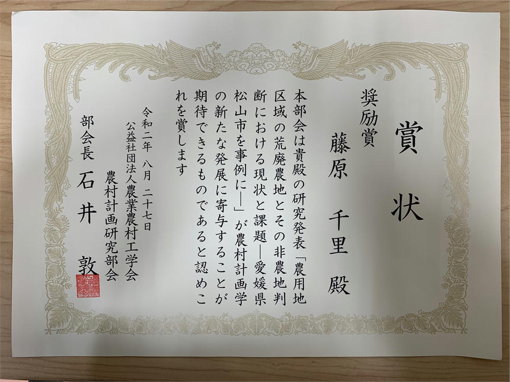 ■大学院修士課程1年・藤原千里さんが,web開催となったR2年度農業農村工学会大会にて,農村計画研究部会・奨励賞を受賞しました. 愛媛大学のHPでも紹介されました. ■シカが道路を通って集落に侵入することを防ぐ「グレーチング」を見学させていただきました. ■樹園地の圃場整備.昨年度は計画段階であった現場で,今年度は施工が行われているのを見ると,当然のこととはいえ感無量です.